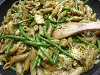 Nudelpfanne mit grünen Bohnen und Pesto
